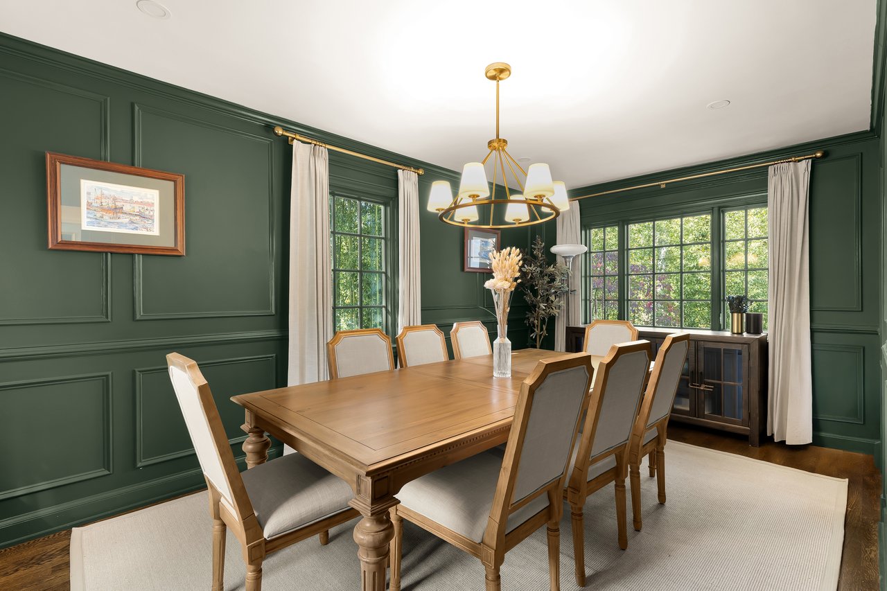 The fully renovated interiors showcase fine craftsmanship, with new millwork, fixtures, and finishes, as well as a reimagined layout that effortlessly supports today’s lifestyle. The front door opens to a traditional foyer flanked by formal dining and living rooms in a dignified center hall configuration. The dining room offers an inviting setting for entertaining, with wooded views framed on three sides by glass and a rich, moody green palette that complements warm oak flooring throughout. The living room, generously scaled at 19 feet in length, is centered on a wood burning fireplace and opens to a serene private office beyond.
