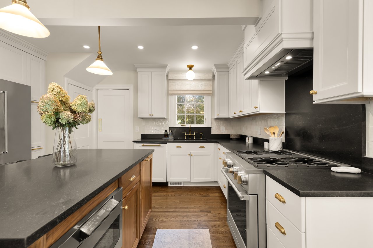 Anchoring the informal areas, the expanded kitchen pairs white Shaker cabinetry with a walnut center island, both topped in honed black stone and fitted with a suite of professional grade appliances. A custom banquette, coffee bar, and breakfast area with a built in bay window seat create an inviting space for casual gatherings with direct access to the new deck.
